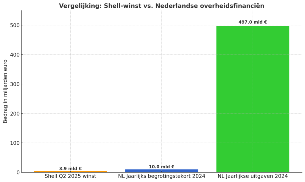 Shell liet in één kwartaal resultaten zien die in sommige jaren gelijk staan aan wat de hele Nederlandse overheid per jaar tekortkomt. In 2024 was het tekort van de Nederlandse staat 10 miljard euro, oftewel 0,9 % van het bruto binnenlands product. De totale rijksuitgaven lagen dat jaar op ongeveer 497 miljard euro, terwijl de inkomsten circa 487 miljard euro waren. Ter vergelijking: Shell’s netto kwartalswinst van 4,26 miljard dollar (omgerekend zo’n 3,9 miljard euro) was dus in één kwartaal bijna 40 % van het hele jaarlijkse begrotingstekort. Investeerders en financiers opereren met zulke getallen als uitkomsten van marktwerking, terwijl de overheid datzelfde ordergrootte aan euro’s moet besteden aan zorg, onderwijs, infrastructuur en sociale zekerheid — en dat ieder jaar opnieuw.